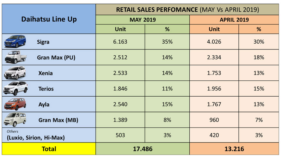 Pada penjualan retail sales Daihatsu masih didominasi oleh Sigra dengan torehan 6.163 unit (35%), diikuti oleh Ayla 2.540 unit (15%), dan Xenia 2.533 unit (14%). Lalu disusul line-up lainnya seperti GranMax Pick up (PU) sebesar 2.512 unit (14%), dan Terios 1.846 unit (11%).